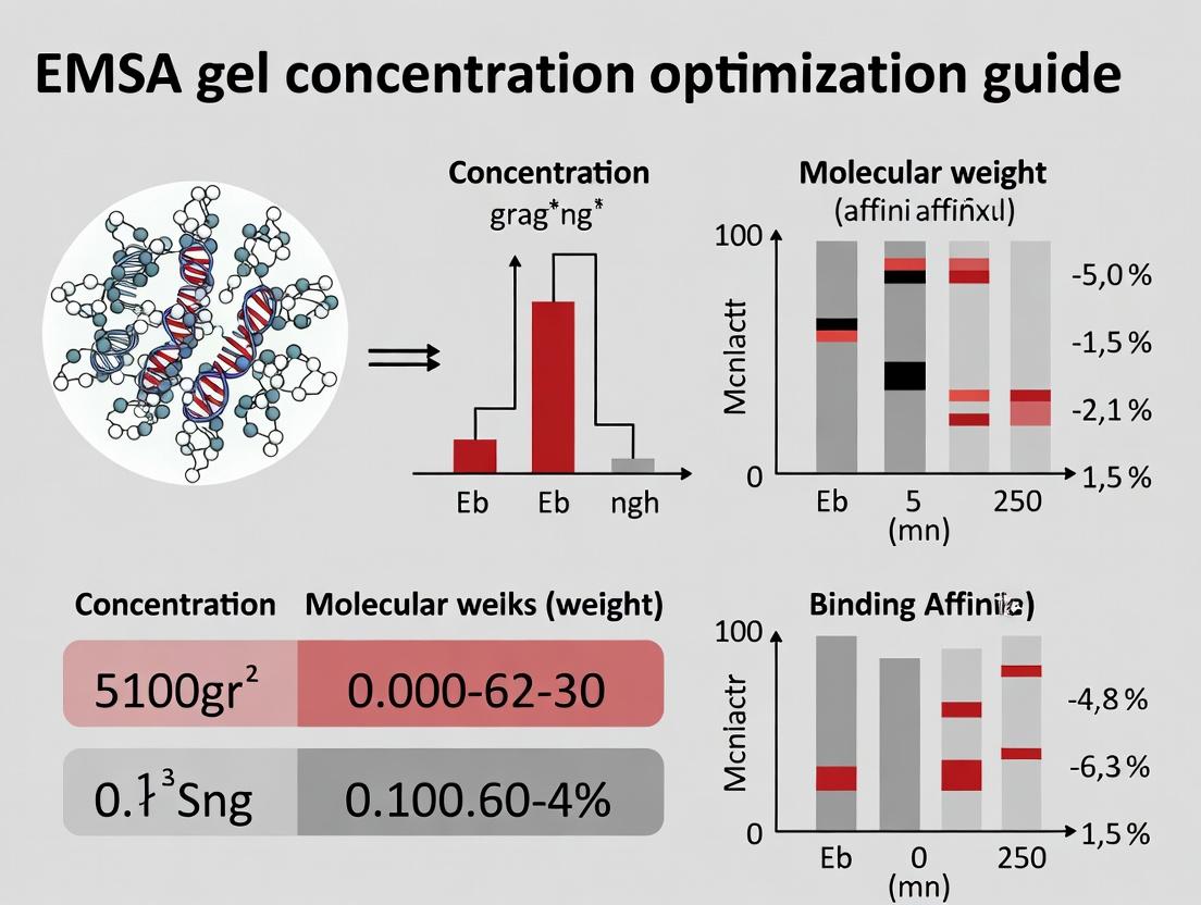 Optimizing gel concentration is not a one-size-fits-all step but a critical, systematic process that dictates the success of the entire EMSA experiment. By mastering the foundational principles, applying a rigorous methodological approach, expertly troubleshooting artifacts, and validating results with robust controls, researchers can transform EMSA from a qualitative technique into a reliable source of quantitative binding data. This optimization is paramount for drug discovery targeting protein-nucleic acid interactions, such as in oncology and antiviral therapies, where accurately measuring binding affinity and stoichiometry informs lead compound development. Future directions involve integrating these optimized EMSA protocols with high-throughput screening platforms and AI-driven predictive modeling of complex migration, further solidifying its role in quantitative molecular biology and translational research.