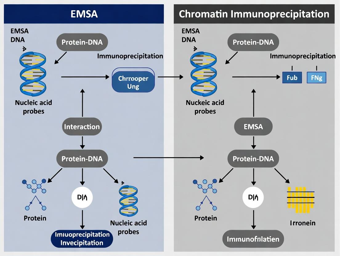 This article provides a detailed, comparative analysis of Electrophoretic Mobility Shift Assay (EMSA) and Chromatin Immunoprecipitation (ChIP), two cornerstone techniques in molecular biology for studying protein-nucleic acid interactions.