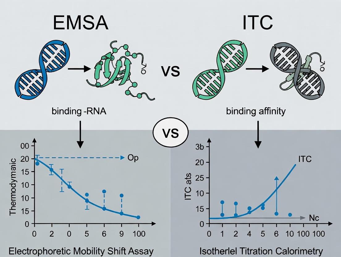 Within the study of protein-RNA interactions, quantifying binding affinity is fundamental. Two core techniques dominate: the Electrophoretic Mobility Shift Assay (EMSA), a versatile and accessible screening tool, and Isothermal Titration Calorimetry (ITC), a gold-standard method for complete thermodynamic characterization. This guide compares their performance, experimental data, and appropriate applications, framing them as complementary pillars within a cohesive research strategy.